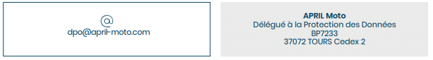 Nous, société APRIL Moto, 14 quai de Marmoutier, 37100 TOURS, pour les finalités et selon les modalités décrites dans ce document. Au sein de nos services, seules les personnes ayant besoin de connaître de vos données dans le cadre de leurs missions y ont accès.